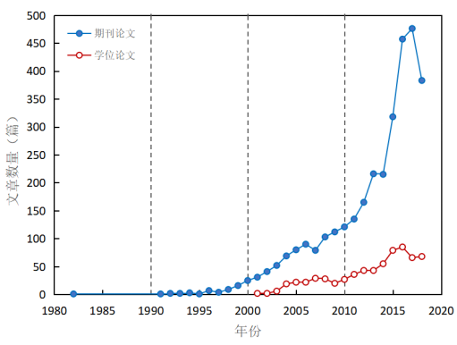 4活躍期(2011—至今):該階段期刊論文和學(xué)位論文的數(shù)量整體呈顯著增長(zhǎng)趨勢(shì),說(shuō)明該階段VOCs研究受到國(guó)內(nèi)學(xué)者的廣泛關(guān)注。“十二五”以來(lái),我國(guó)在VOCs管控政策制定方面的力度不斷增強(qiáng)。根據(jù)統(tǒng)計(jì),該時(shí)期我國(guó)頒布出臺(tái)的涉VOCs管控的政策文件共7項(xiàng)、國(guó)家排放標(biāo)準(zhǔn)共12項(xiàng),這些政策與標(biāo)準(zhǔn)的相繼出臺(tái)極大促進(jìn)了該領(lǐng)域研究的不斷繁榮。