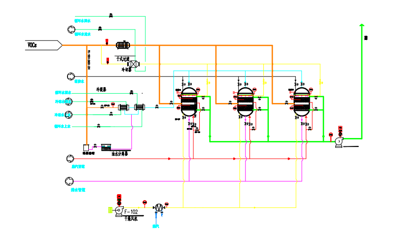采用熱氮?dú)饣蝻柡退魵饷摳降耐钆淅淠到y(tǒng),來(lái)實(shí)現(xiàn)對(duì)VOCs的回收再利用。由于水蒸氣載熱量大,尤其是其潛熱;且脫附溫度適中,不會(huì)破壞有機(jī)物,因此水蒸氣是最常用的脫附劑。