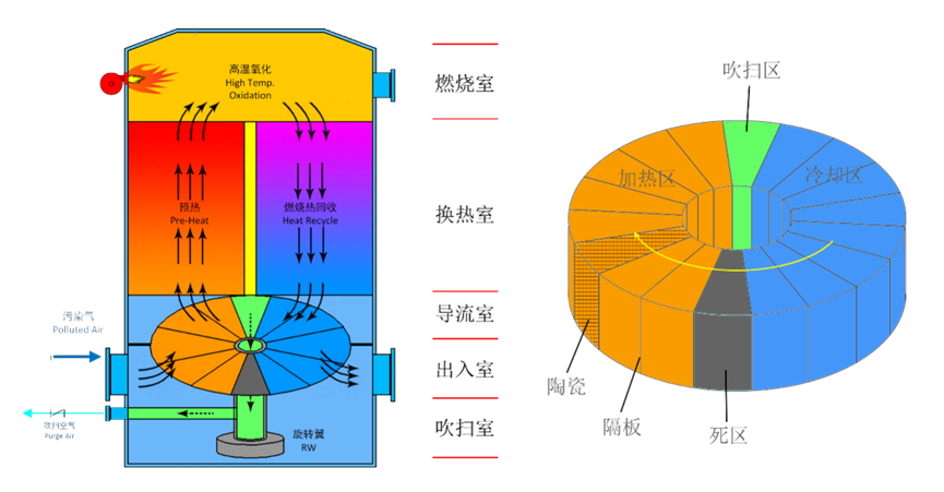 旋轉(zhuǎn)式RTO出現(xiàn)在20世紀(jì)90年代末,是RTO發(fā)展的第三代技術(shù)。通過(guò)旋轉(zhuǎn)閥 (蓄熱筒) 旋轉(zhuǎn)、分度、廢氣均布等動(dòng)作,順序地引導(dǎo)廢氣進(jìn)入或排出燃燒室的特定部分。通過(guò)在轉(zhuǎn)子表面設(shè)置的密封裝置,將轉(zhuǎn)子分成入口和出口兩部分,通過(guò)這兩部分分別將處理前的廢氣和凈化后氣體引入或排出 RTO 燃燒室。目前旋轉(zhuǎn)式RTO的發(fā)展過(guò)程中在其旋轉(zhuǎn)閥的運(yùn)行方式,吹掃的方式、密封方式以及蓄熱室的分區(qū)都有不一樣的設(shè)計(jì),因此也衍生出不同的類(lèi)型的RTO。
