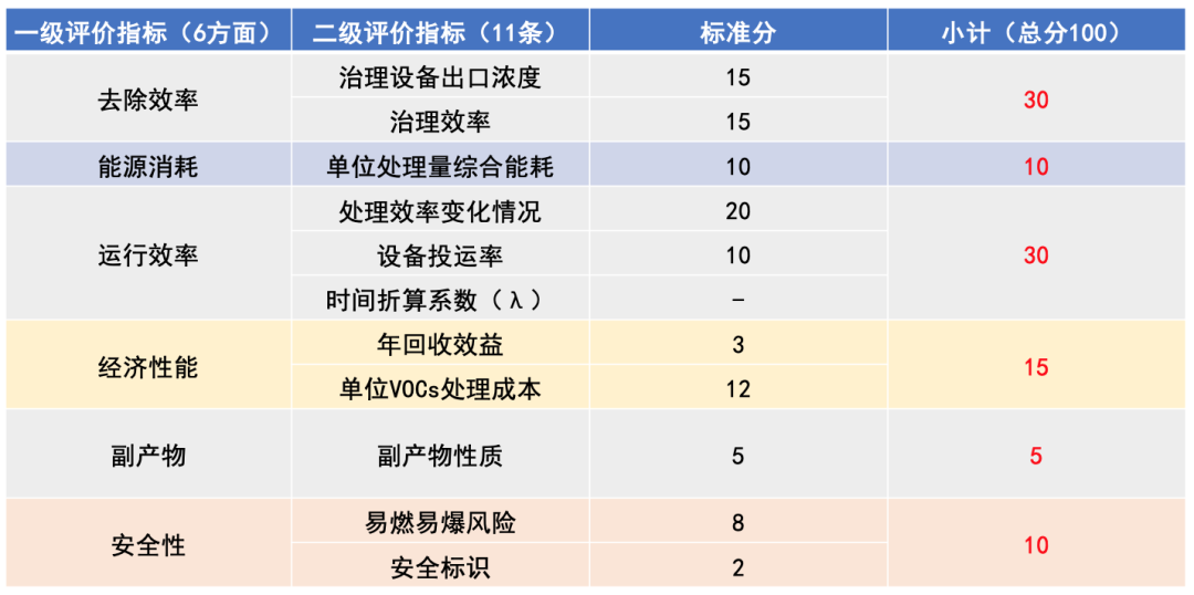 翻開《指南》,可以發(fā)現(xiàn)內(nèi)容編制處處體現(xiàn)出張新民所說的“從更全面的角度量化體現(xiàn)技術(shù)用在企業(yè)主體上是否合適”這一宗旨,如設(shè)立包含去除效率、能源消耗、運(yùn)行效率、經(jīng)濟(jì)性能、副產(chǎn)物、安全性在內(nèi)的六項(xiàng)一級評價指標(biāo),以及出口濃度、綜合能耗、副產(chǎn)物性質(zhì)等11項(xiàng)二級評價指標(biāo)。