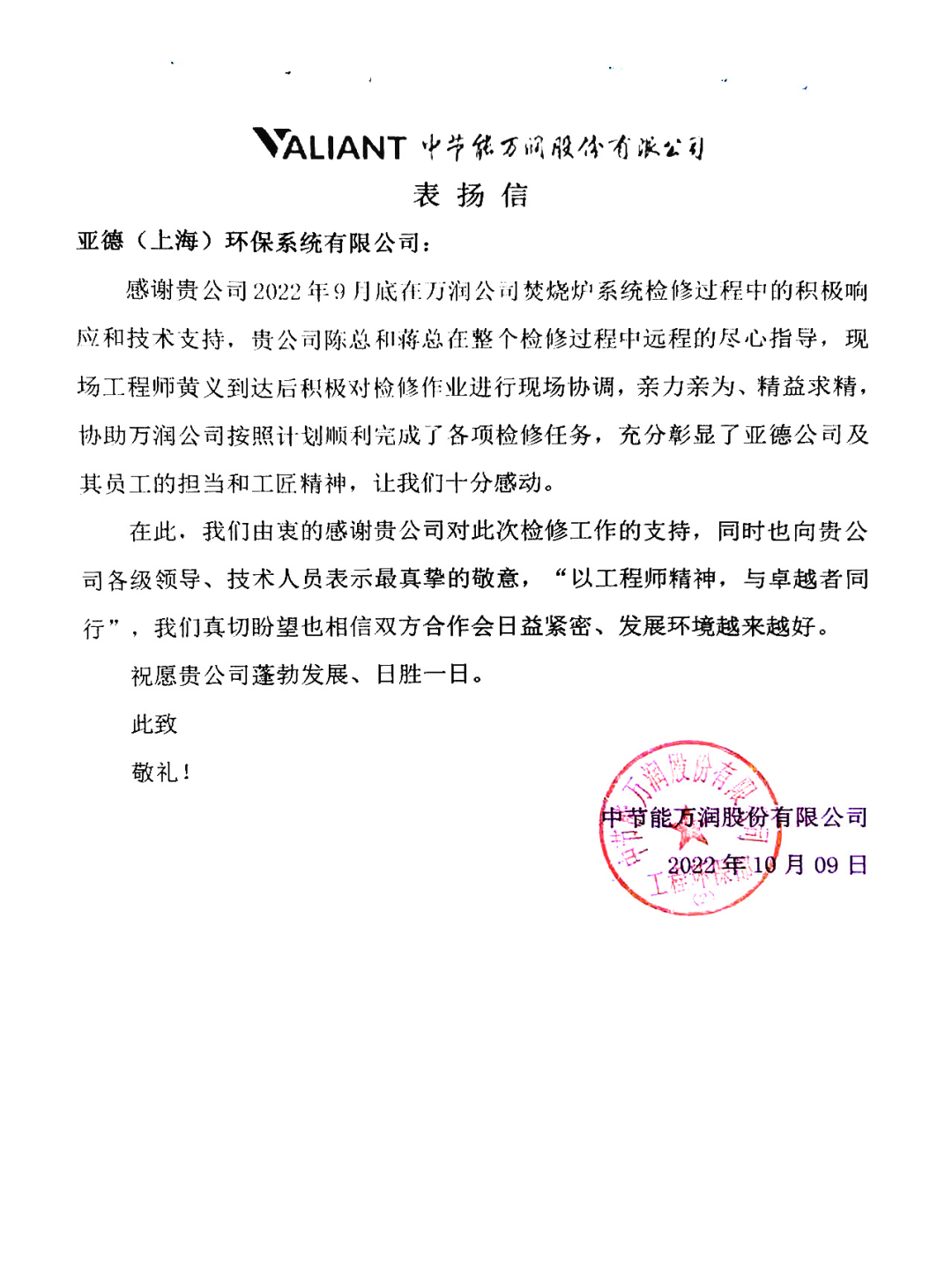亞德環(huán)保獲中節(jié)能萬潤股份有限公司表揚信!