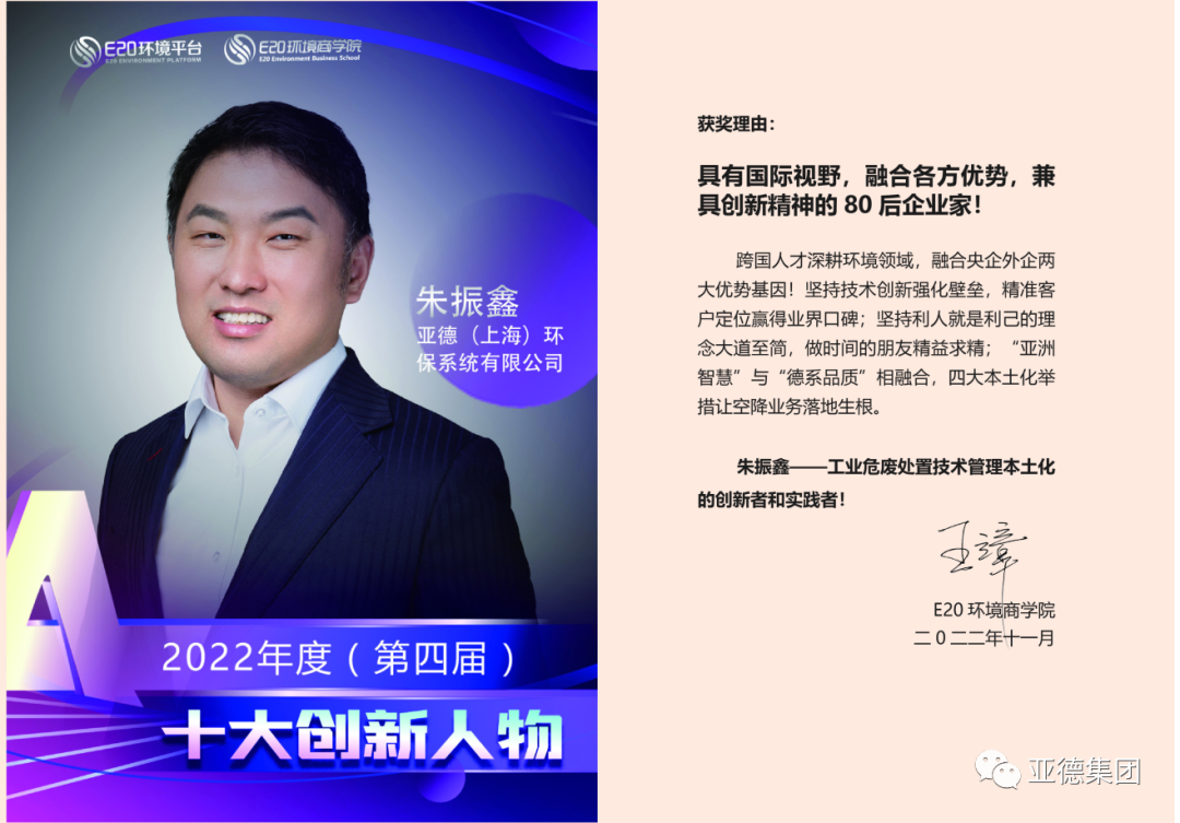 因廣闊的國際視野和多年來在工業(yè)危廢處置技術(shù)管理本土化的創(chuàng)新與實(shí)踐,亞德環(huán)保朱振鑫總經(jīng)理獲評2022年度E20環(huán)境商學(xué)院 “十大創(chuàng)新人物”。
