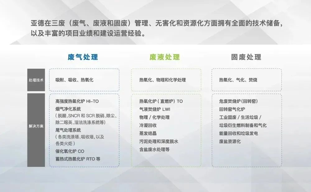 亞德環(huán)保在三廢(廢氣、廢液和固廢)管理、無害化和資源化方面擁有全面的技術儲備,以及豐富的項目業(yè)績和建設運營經驗。