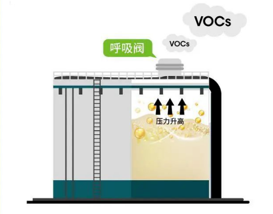大呼吸是指儲罐進出物料時,液體進入儲罐內,罐內液位升高,擠壓罐內空間,當空間壓力超過“呼吸閥”的呼出控制壓力時,將VOCs氣體排放到大氣中。