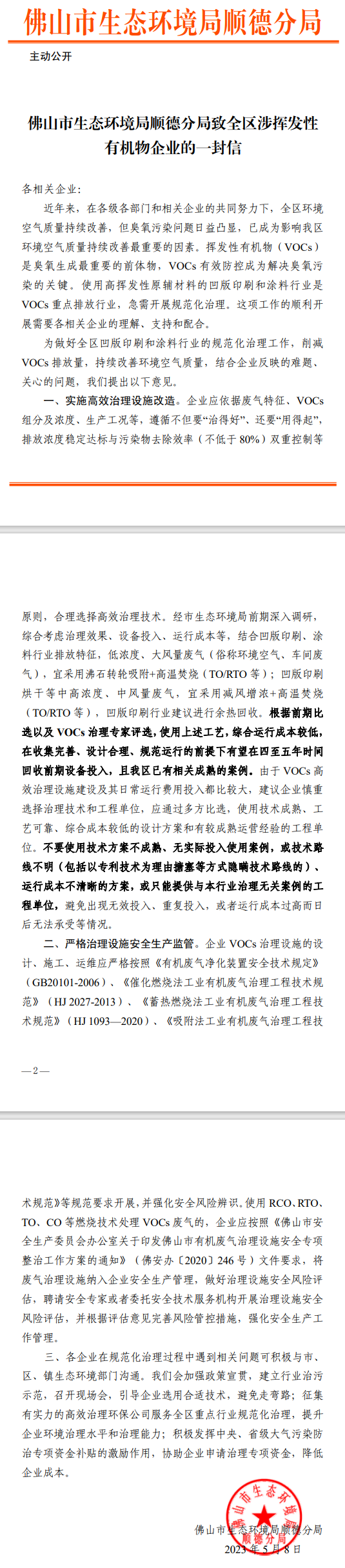亞德環(huán)保導讀:日前,佛山順德發(fā)布《致全區(qū)涉揮發(fā)性有機物企業(yè)的一封信》,要求不要使用技術方案不成熟、無實際投入使用案例,或技術路線不明、運行成本不清晰的方案,或只能提供與本行業(yè)治理無關案例的工程單位。